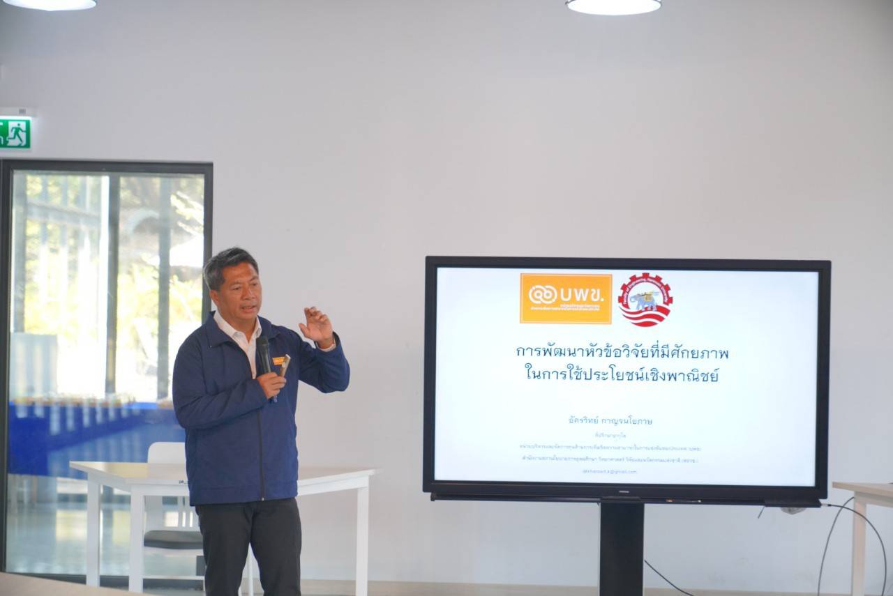 กิจกรรมครั้งนี้ได้รับเกียรติจาก ผู้ช่วยศาสตราจารย์ ดร.อัครวิทย์ กาญจนโอภาษ รองเลขาธิการสำนักงานคณะกรรมการนโยบายวิทยาศาสตร์ เทคโนโลยีและนวัตกรรมแห่งชาติ บรรยายพิเศษในหัวข้อ “การพัฒนาหัวข้อวิจัยที่มีศักยภาพในการใช้ประโยชน์เชิงพาณิชย์” เพื่อเป็นแนวทางให้แก่นักวิจัยสามารถพัฒนาผลงานที่ไม่เพียงตอบโจทย์วิชาการ แต่ยังสร้างมูลค่าเพิ่มในเชิงธุรกิจและอุตสาหกรรม