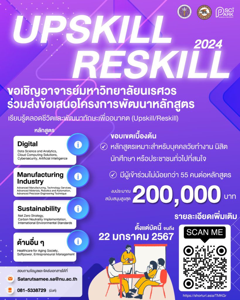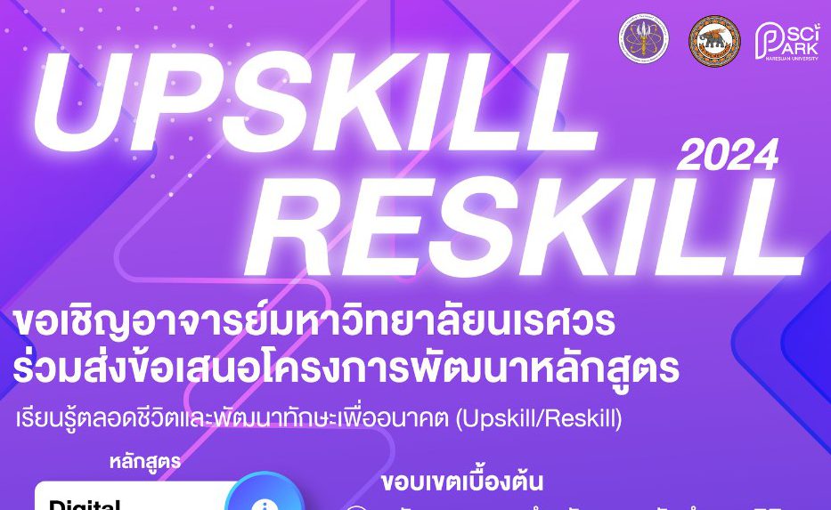 มหาวิทยาลัยนเรศวรเชิญชวนอาจารย์ทุกท่านส่งข้อเสนอโครงการพัฒนาหลักสูตรภายใต้หัวข้อ “เรียนรู้ตลอดชีวิตและพัฒนาทักษะเพื่ออนาคต UPSKILL/RESKILL” ประจำปี 2567 โดยมุ่งเน้นการสร้างโอกาสการเรียนรู้และพัฒนาทักษะที่ตอบโจทย์โลกยุคใหม่