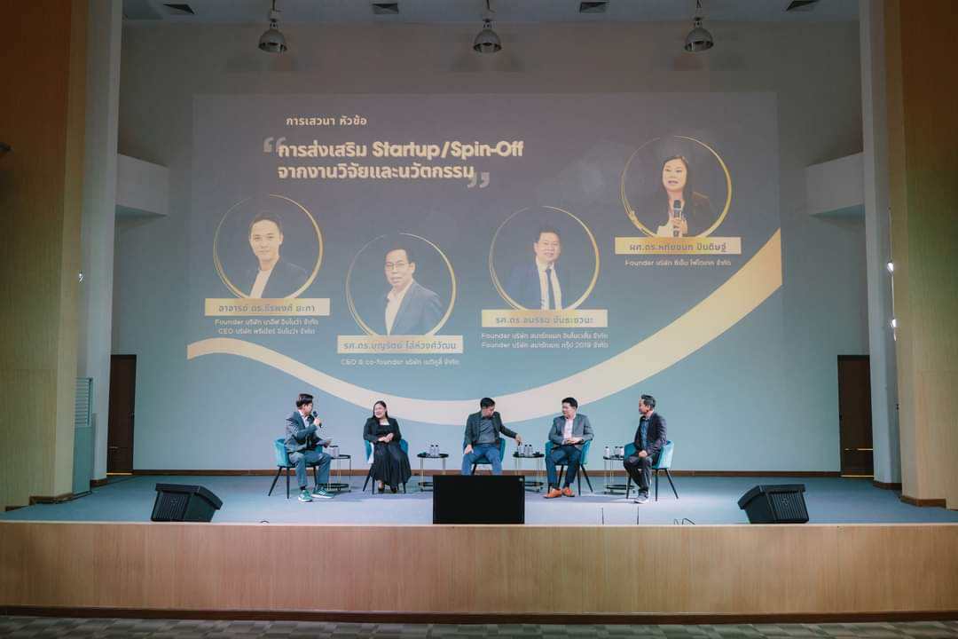ในช่วงเสวนาปิดท้าย มีการแลกเปลี่ยนประสบการณ์และแนวทางในหัวข้อ “การส่งเสริม Startup/Spin-Off จากงานวิจัยและนวัตกรรม” ซึ่งเป็นเวทีให้ผู้เข้าร่วมได้เห็นตัวอย่างความสำเร็จ และแนวทางการพัฒนาธุรกิจนวัตกรรมในอนาคต โดยอาศัยความร่วมมือจากหลากหลายภาคส่วน