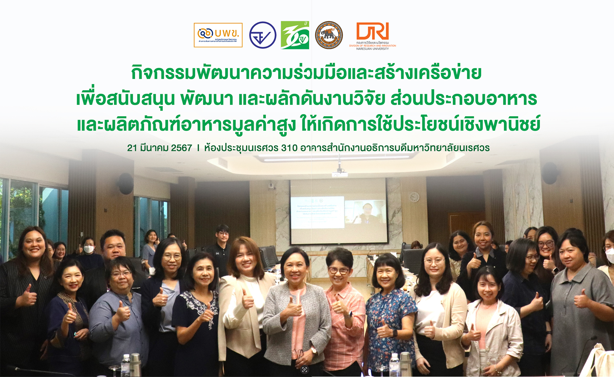 วันพฤหัสบดีที่ 21 มีนาคม 2567 มหาวิทยาลัยนเรศวร ร่วมกับมูลนิธิสำนักงานคณะกรรมการอาหารและยา จัดกิจกรรมพัฒนาความร่วมมือและสร้างเครือข่าย เพื่อสนับสนุน พัฒนา และผลักดันงานวิจัย ส่วนประกอบอาหาร และผลิตภัณฑ์อาหารมูลค่าสูง ให้เกิดการใช้ประโยชน์เชิงพาณิชย์ โดยได้รับการสนับสนุนจากหน่วยบริหารและจัดการทุนด้านการเพิ่มความสามารถในการแข่งขันของประเทศ (บพข.)