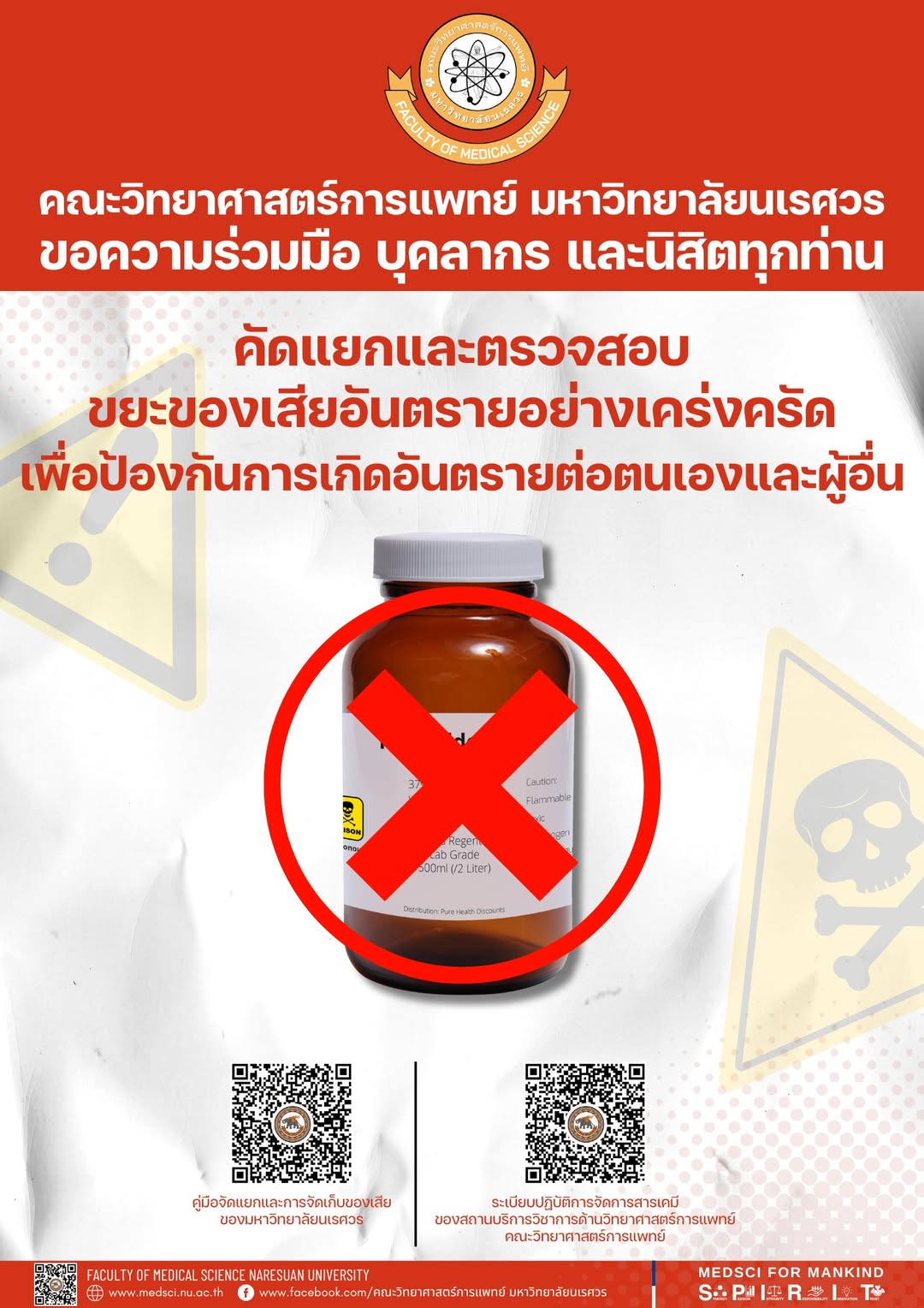 วันพุธที่ 20 มีนาคม 2567 คณะวิทยาศาสตร์การแพทย์ มหาวิทยาลัยนเรศวร ได้ประกาศขอความร่วมมือจากบุคลากรและนิสิตทุกท่าน ในการ คัดแยกและตรวจสอบขยะของเสียอันตรายอย่างเคร่งครัด เพื่อสร้างความปลอดภัยในการทำงานและการเรียนการสอน รวมทั้งเป็นการยกระดับมาตรการด้านสิ่งแวดล้อมที่สอดคล้องกับแนวทางการพัฒนาที่ยั่งยืน