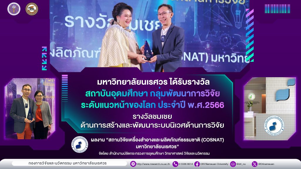 วันพุธที่ 27 มีนาคม 2567 ศาสตราจารย์ ดร.กรกนก อิงคนินันท์ รองอธิการบดีฝ่ายพัฒนางานวิจัยและนวัตกรรม พร้อมด้วย รองศาสตราจารย์ ดร.เนติ วระนุช ผู้อำนวยการสถานวิจัยเครื่องสำอางและผลิตภัณฑ์ธรรมชาติ คณะเภสัชศาสตร์ มหาวิทยาลัยนเรศวร เข้ารับรางวัล สถาบันอุดมศึกษา กลุ่มพัฒนาการวิจัยระดับแนวหน้าของโลก ประจำปี พ.ศ.2566 ด้านที่ 3 การสร้างและพัฒนาระบบนิเวศด้านการวิจัย ประเภทรางวัลชมเชย โดยได้รับเกียรติจากคุณศุภมาส อิศรภักดี รัฐมนตรีว่าการกระทรวงการอุดมศึกษา วิทยาศาสตร์ วิจัยและนวัตกรรม เป็นผู้มอบรางวัล ณ ห้อง Eternity Ballroom โรงแรมพูลแมน คิง เพาเวอร์ ถนนรางน้ำ กรุงเทพมหานคร