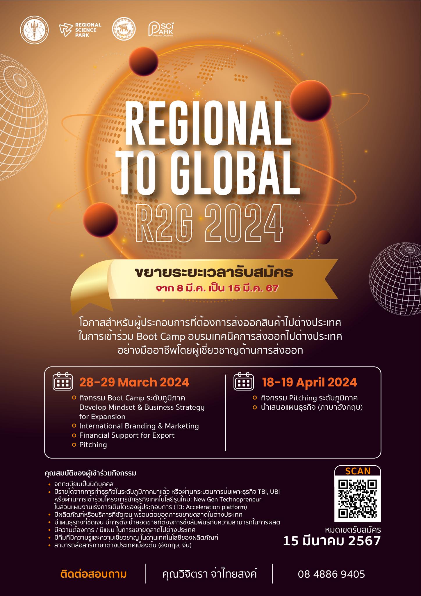 อุทยานวิทยาศาสตร์มหาวิทยาลัยนเรศวร เปิดรับสมัครผู้ประกอบการเข้าร่วมโครงการ REGIONAL TO GLOBAL (R2G2024) เพื่อเชื่อมโยงผู้ประกอบการในระดับภูมิภาคสู่ลูกค้าในระดับโลก ผ่านการ ส่งเสริมและยกระดับศักยภาพด้านการตลาด เทคโนโลยี และนวัตกรรม ด้วยเครือข่ายความร่วมมือของอุทยานวิทยาศาสตร์ภูมิภาคทั่วประเทศ โดยมีเป้าหมายเพื่อสร้างผู้ประกอบการนวัตกรรมไทยให้สามารถแข่งขันในตลาดต่างประเทศได้อย่างยั่งยืน