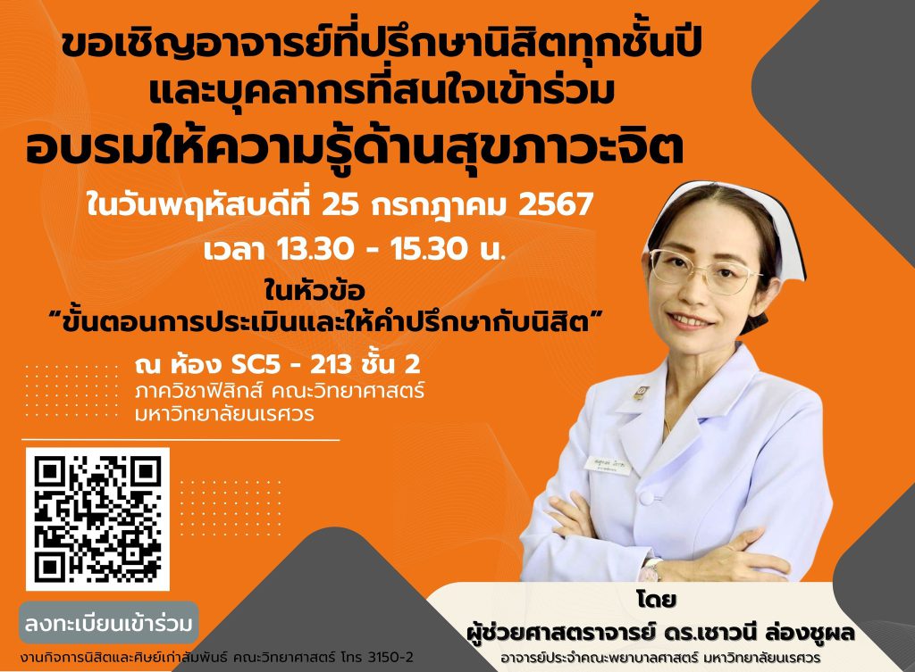 วันพฤหัสบดีที่ 25 กรกฎาคม 2567 โรงเรียนและคณะวิทยาศาสตร์ มหาวิทยาลัยนเรศวร จัดกิจกรรม อบรมให้ความรู้ด้านสุขภาวะจิต ภายใต้หัวข้อ “ขั้นตอนการประเมินและให้คำปรึกษากับนิสิต” โดยเชิญอาจารย์ที่ปรึกษานิสิตทุกชั้นปีและบุคลากรที่สนใจเข้าร่วม เพื่อเสริมสร้างความรู้ ความเข้าใจ และทักษะการดูแลสุขภาพจิตของนิสิตอย่างเป็นระบบ