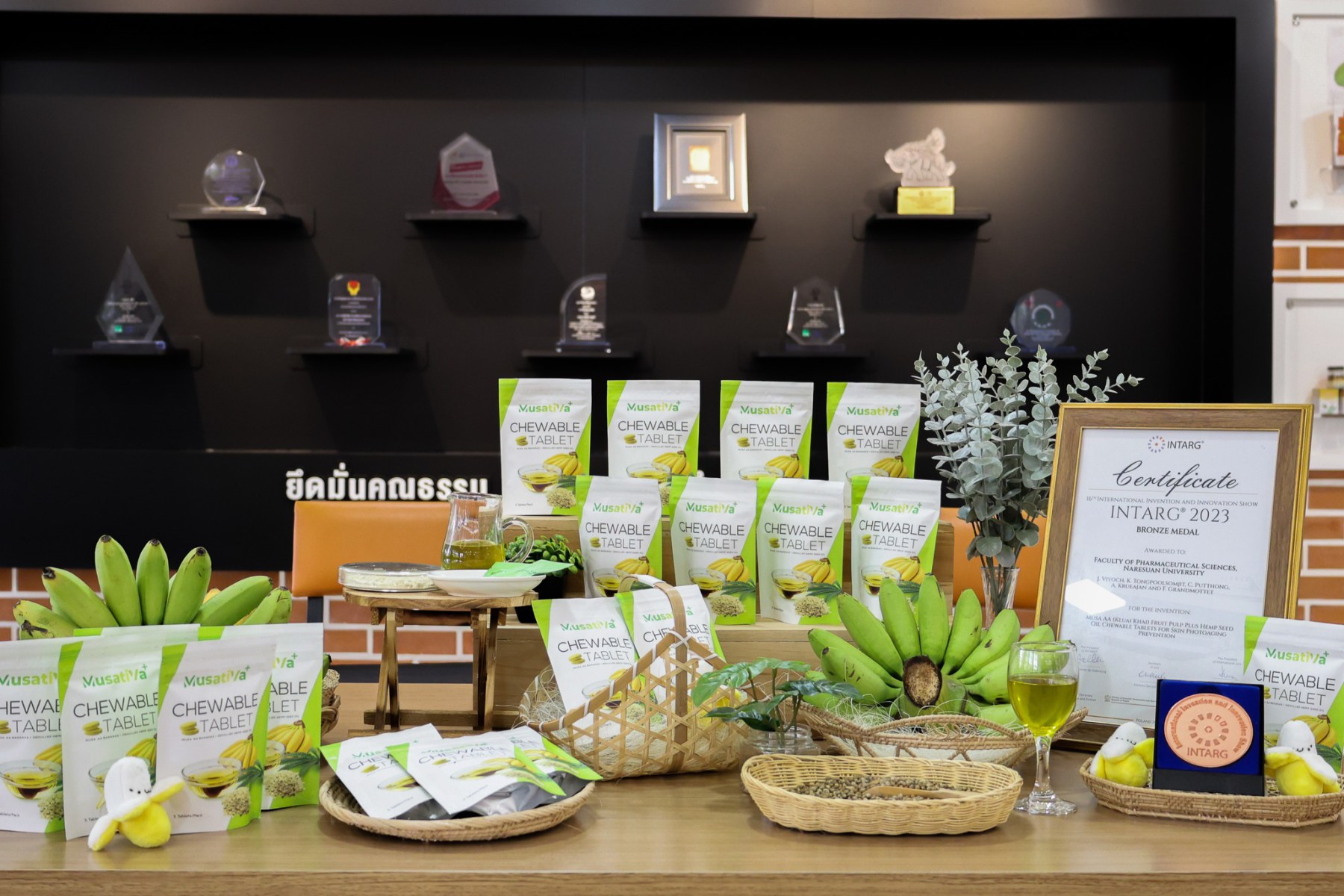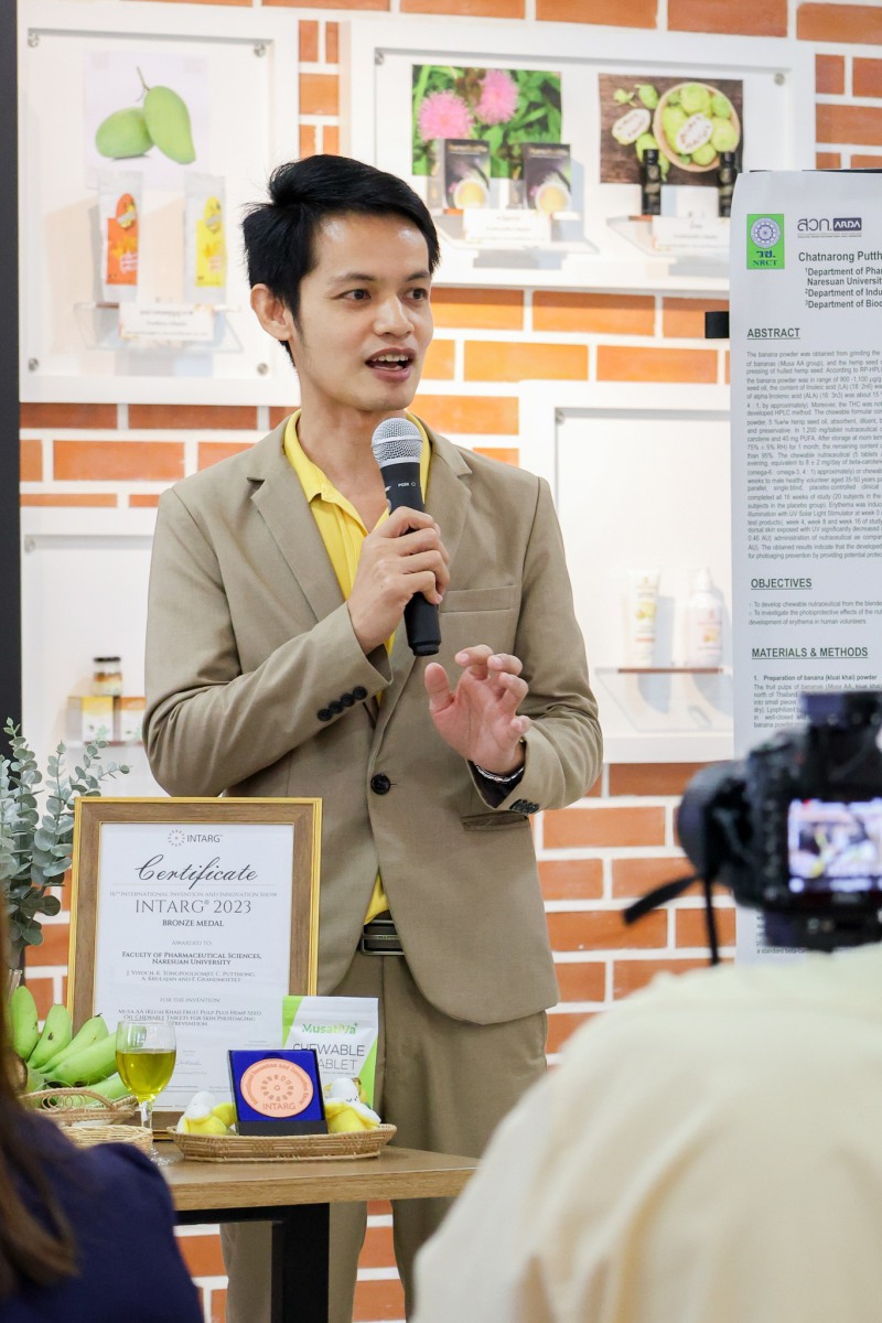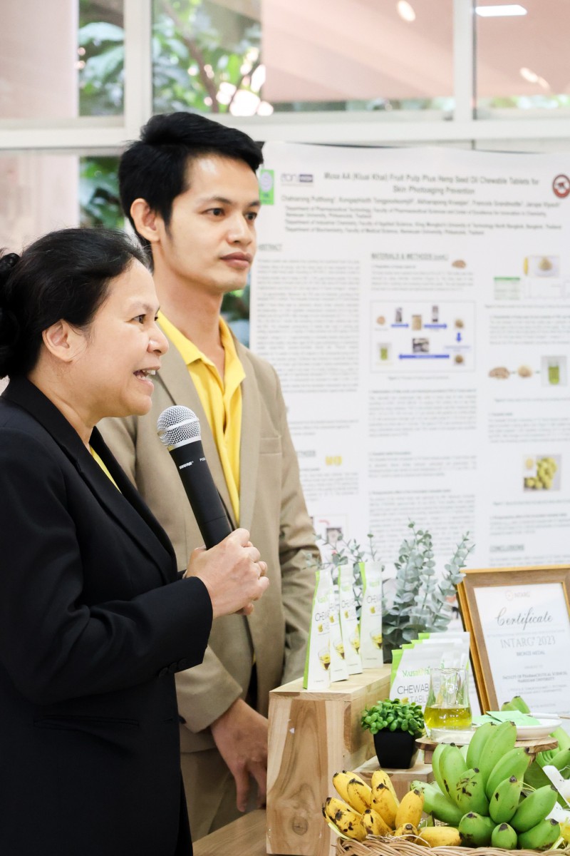 ผลิตภัณฑ์นิวตราซูติคอลเม็ดเคี้ยวกล้วยไข่ผสมน้ำมันเมล็ดกัญชงนี้ ได้รับการออกแบบเพื่อเพิ่มการดูดซึมสารสำคัญอย่างเบต้า-แคโรทีน ซึ่งมีคุณสมบัติในการป้องกันการแดงของผิวหนังจากการสัมผัสแสงแดด โดยนวัตกรรมนี้ถือเป็นการแปรรูปสินค้าเกษตรให้เป็นผลิตภัณฑ์มูลค่าสูงด้วยวิทยาศาสตร์ เทคโนโลยี และนวัตกรรม