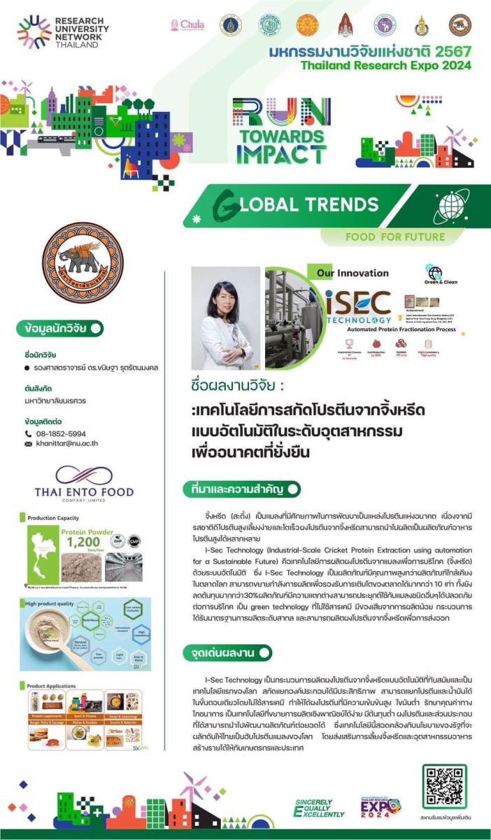 สำหรับกลุ่ม Food for Future ได้จัดแสดงผลงานวิจัย I-Sec Technology: เทคโนโลยีการสกัดโปรตีนจากจิ้งหรีดแบบอัตโนมัติในระดับอุตสาหกรรมเพื่ออนาคตที่ยั่งยืน โดย รองศาสตราจารย์ ดร.ขนิษฐา รุตรัตนมงคล จากคณะเกษตรศาสตร์ ทรัพยากรธรรมชาติและสิ่งแวดล้อม ตอบสนองต่อความมั่นคงทางอาหารในอนาคตและการใช้ทรัพยากรอย่างคุ้มค่า