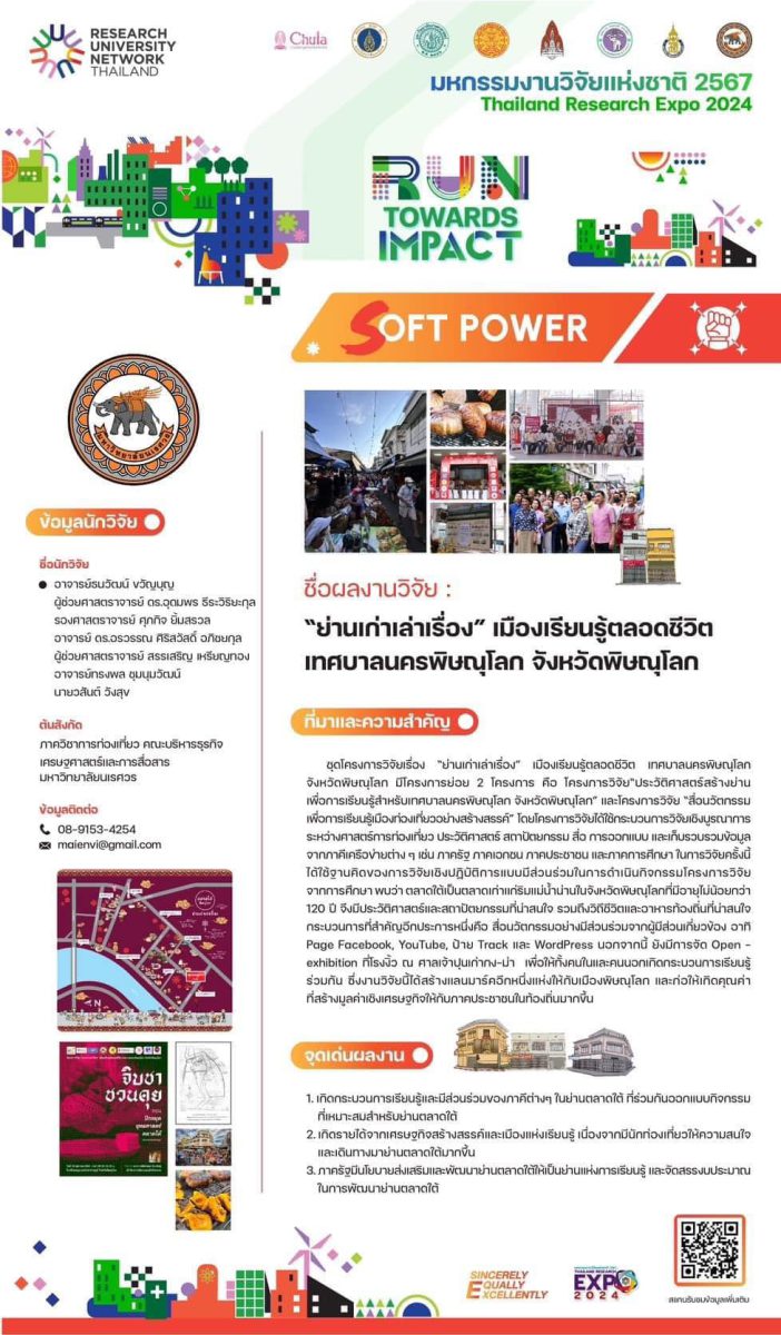 ในด้าน Soft Power ได้นำเสนอผลงาน “ย่านเก่าเล่าเรื่อง” เมืองเรียนรู้ตลอดชีวิต เทศบาลนครพิษณุโลก จังหวัดพิษณุโลก โดย อาจารย์ธนวัฒน์ ขวัญบุญ และคณะ จากคณะบริหารธุรกิจ เศรษฐศาสตร์และการสื่อสาร ที่เน้นการใช้พลังวัฒนธรรมและพื้นที่ชุมชนเป็นเครื่องมือในการสร้างเมืองแห่งการเรียนรู้