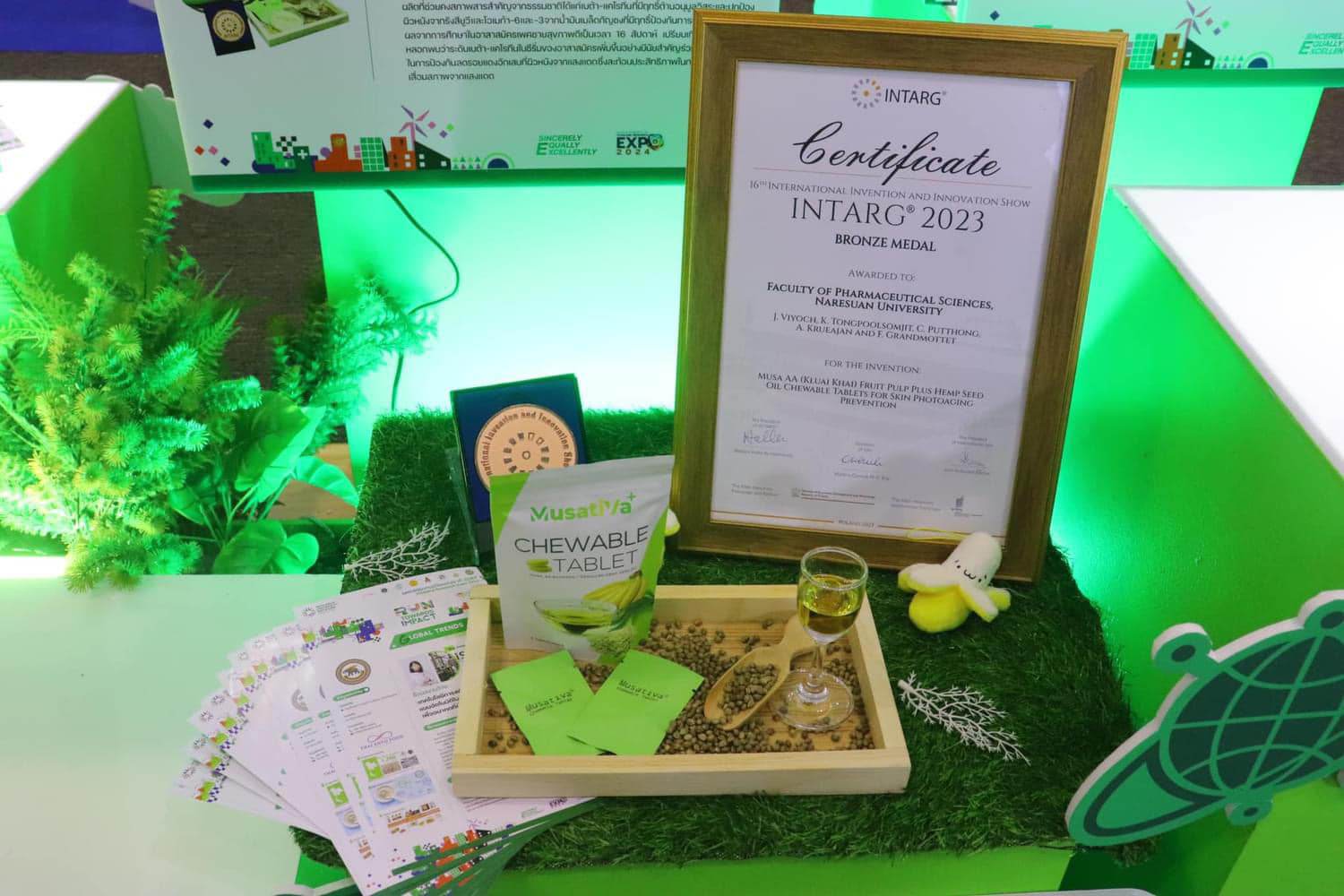 ในกลุ่ม Health and Well-Being ม.นเรศวรนำเสนอผลงานวิจัยเรื่อง เม็ดเคี้ยวผลกล้วยไข่ผสมน้ำมันเมล็ดกัญชง เพื่อป้องกันผิวหนังเสื่อมสภาพจากแสงแดด โดย ศาสตราจารย์ ดร.จารุภา วิโยชน์ และคณะ จากคณะเภสัชศาสตร์ ซึ่งเป็นการพัฒนานวัตกรรมที่ผสมผสานภูมิปัญญาท้องถิ่นกับองค์ความรู้ทางวิทยาศาสตร์