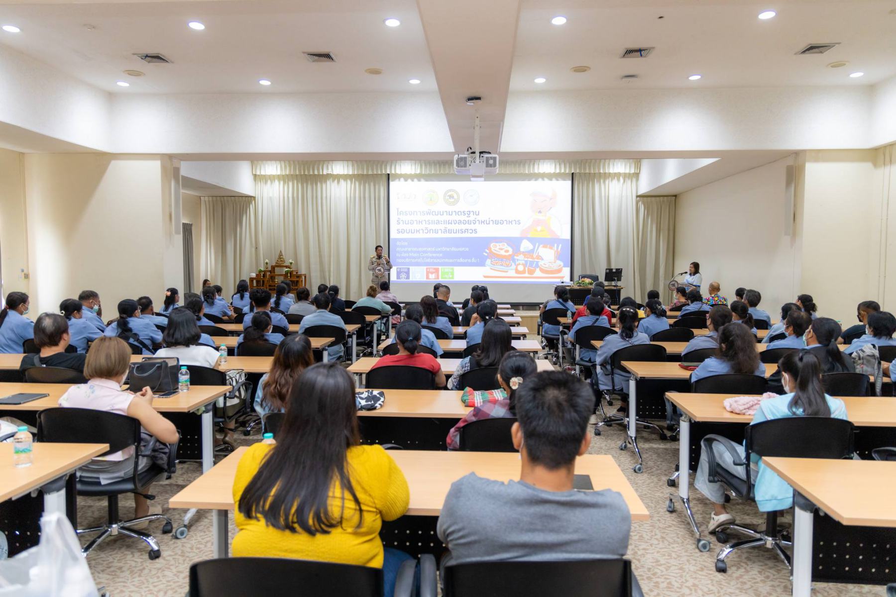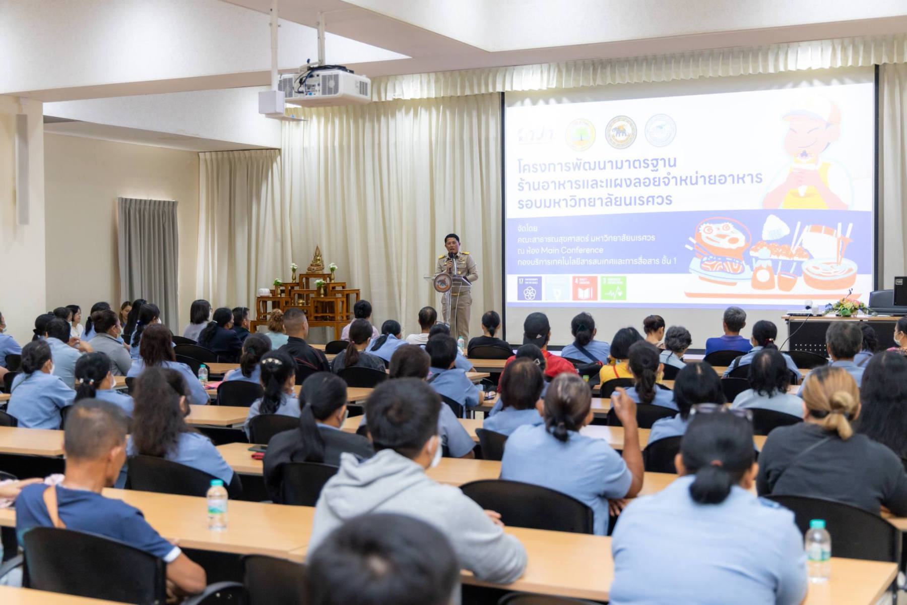 โครงการครั้งนี้ได้รับเกียรติจากนายธวัช สิงห์เดช นายกองค์การบริหารส่วนตำบลท่าโพธิ์ และรองศาสตราจารย์ ดร.นิทรา กิจธีระวุฒิวงษ์ คณบดีคณะสาธารณสุขศาสตร์ มหาวิทยาลัยนเรศวร ร่วมเป็นประธานเปิดโครงการ ณ ห้อง Main Conference อาคารบริการเทคโนโลยีสารสนเทศและการสื่อสาร ซึ่งเป็นเวทีที่เปิดโอกาสให้ผู้ประกอบการร้านอาหารและอาสาสมัครสาธารณสุขได้เข้ามาเรียนรู้และพัฒนาทักษะร่วมกัน